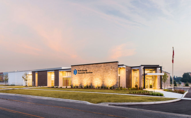 The Emergency Management Services (EMS) facility headquarters was an exciting opportunity to provide space to meet the operational and administrative needs of Perth County Emergency Medical Service and the Perth County Emergency Management Department. Secondarily the building provides additional resources for the Corporation of the County of Perth through additional meeting and training spaces, offices and IT back up infrastructure. It was important that the building was energy efficient, had bright natural lighting to provide a motivating work environment and promote a safe and secure environment for staff. The building is equipped with controlled access doors, security cameras in common areas, and intercom systems. The design facilitates easy to maintain infection control and integrates with the Ministry of Health Central Ambulance Communication Centre radio communications and paging systems. Architecturally, the new EMS facility uses sustainable materials with long lifespans that require minimal maintenance. The exterior walls are concrete block with exterior brick and decorative stone. The administration area roof is flat consisting of a two-ply modified bitumen system complete with pre-finished metal flashings and trims with the ambulance bay portion being a sloped metal roof. The interior finishes contain a mixture of painted concrete block and abuse resistant gypsum board. Ceilings are generally acoustical tiles, gypsum board or exposed structure. Floor finishes are ceramic tile, or vinyl depending on the use of the rooms. The HVAC and electrical system is controlled by a computerized building automation system that monitors building usage to provide optimum energy efficiency.