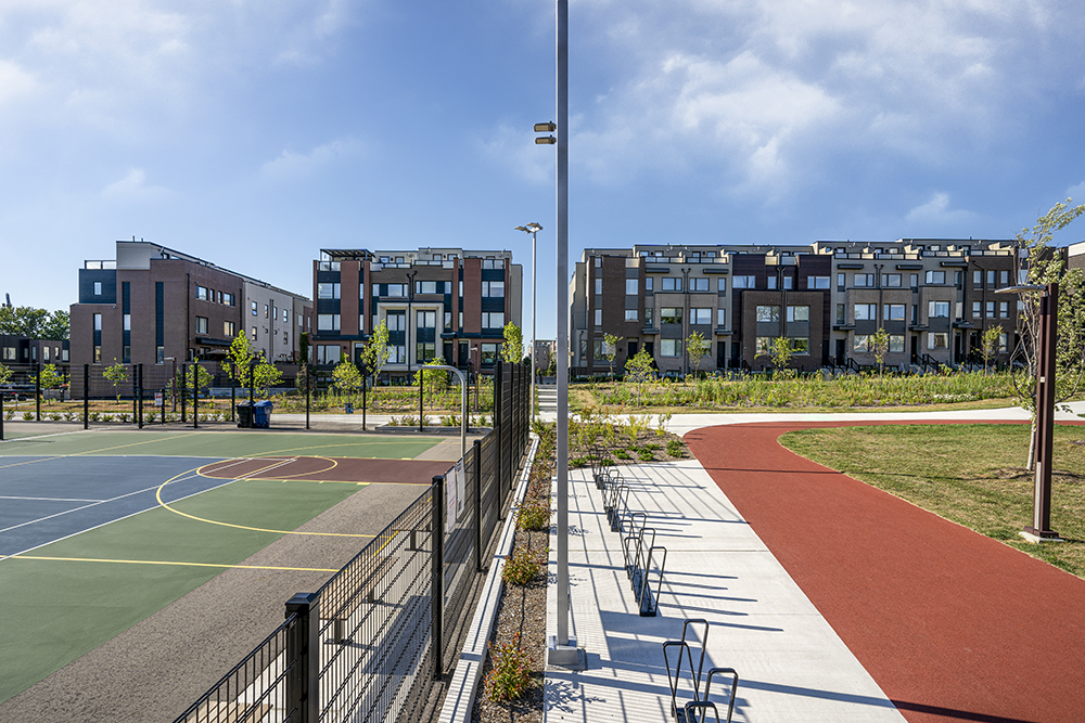 Completed in Fall of 2019, this urban park includes a large playground and fitness area, a 5,500 sq ft splash pad and 9,000 sq ft CIP concrete skatepark. The park is anchored by an iconic washroom building clad with corten steel panels and roofed with a 2,200 sq ft canopy also providing outdoor shaded space. Decorative pavements include concrete, unit paving, a rubber surfaced walking loop and Kebony wood boardwalk. Two lit and fenced tennis courts have coloured plexipave surfacing. DESIGN TEAM Forrec Brad Keeler P: 416-696-8686 E: bkeeler@forrec.com Other amenities include seatwalls, benches, picnic tables with umbrellas and a fire pit. The project also required installation of custom art benches supplied by Michael Singer Art Studio, with LED strip lighting. Softscape included extensive plantings and sodded lawns. The project required full site services including hydro, watermain, sanitary & storm, with irrigation, a rink hydrant and bottle filling station. LID features include a rain garden with bio-retention media, and a network of french drains and infiltration pits. The park incorporates 8 very large 500-700mm caliper existing trees which had to be protected during construction.