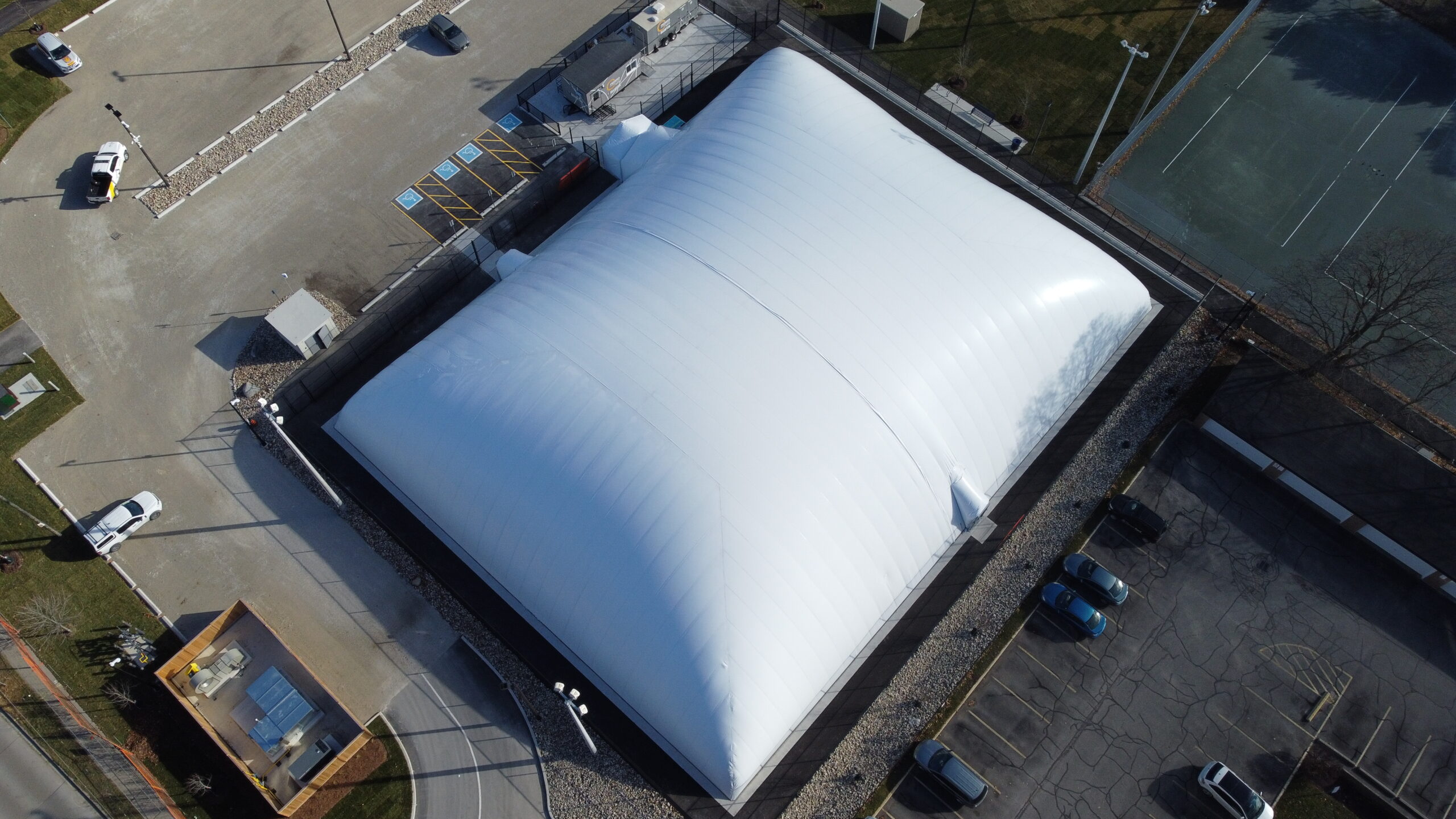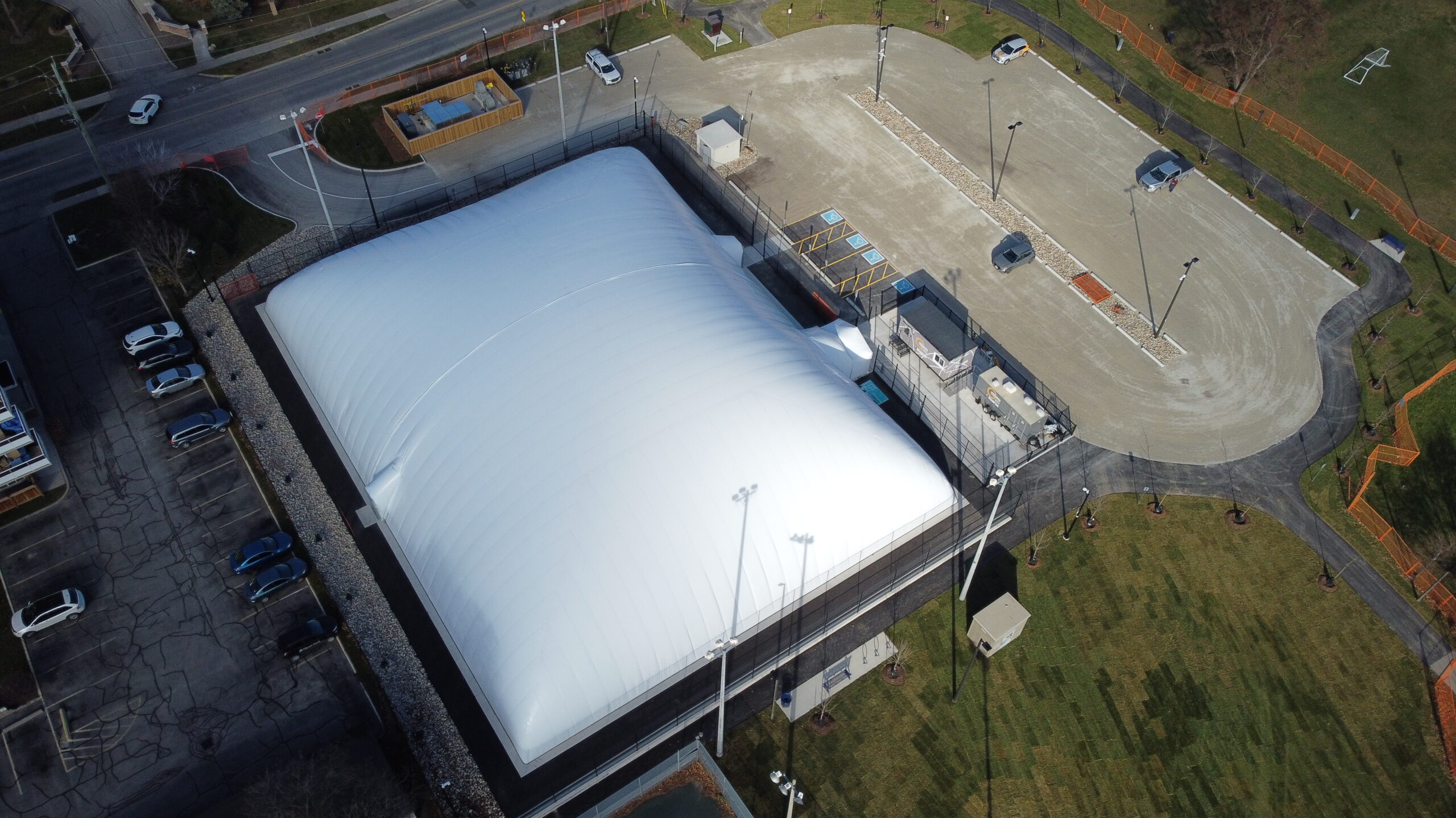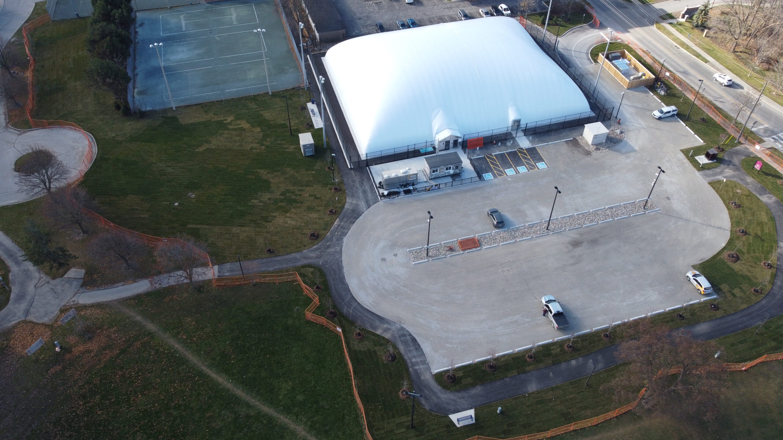This fast-track design build project required a team approach to gain approvals from all authorities having jurisdiction including Region of Peel, TRCA and City of Brampton Planning & Engineering departments. The project required storm water management as well as water servicing with upgrades to existing watermain systems. The dome includes underground mechanical vaults and shafts with concrete foundations on helical piles. Courts are asphalt with Har-Tru surfacing. Additional features include exterior sports lighting, 10′ ht tennis fencing, an operations compound with washroom and office facilities, new parking and landscaping. The project also includes security cameras and systems, BAS and PSN network with panels housed in a new utility building.